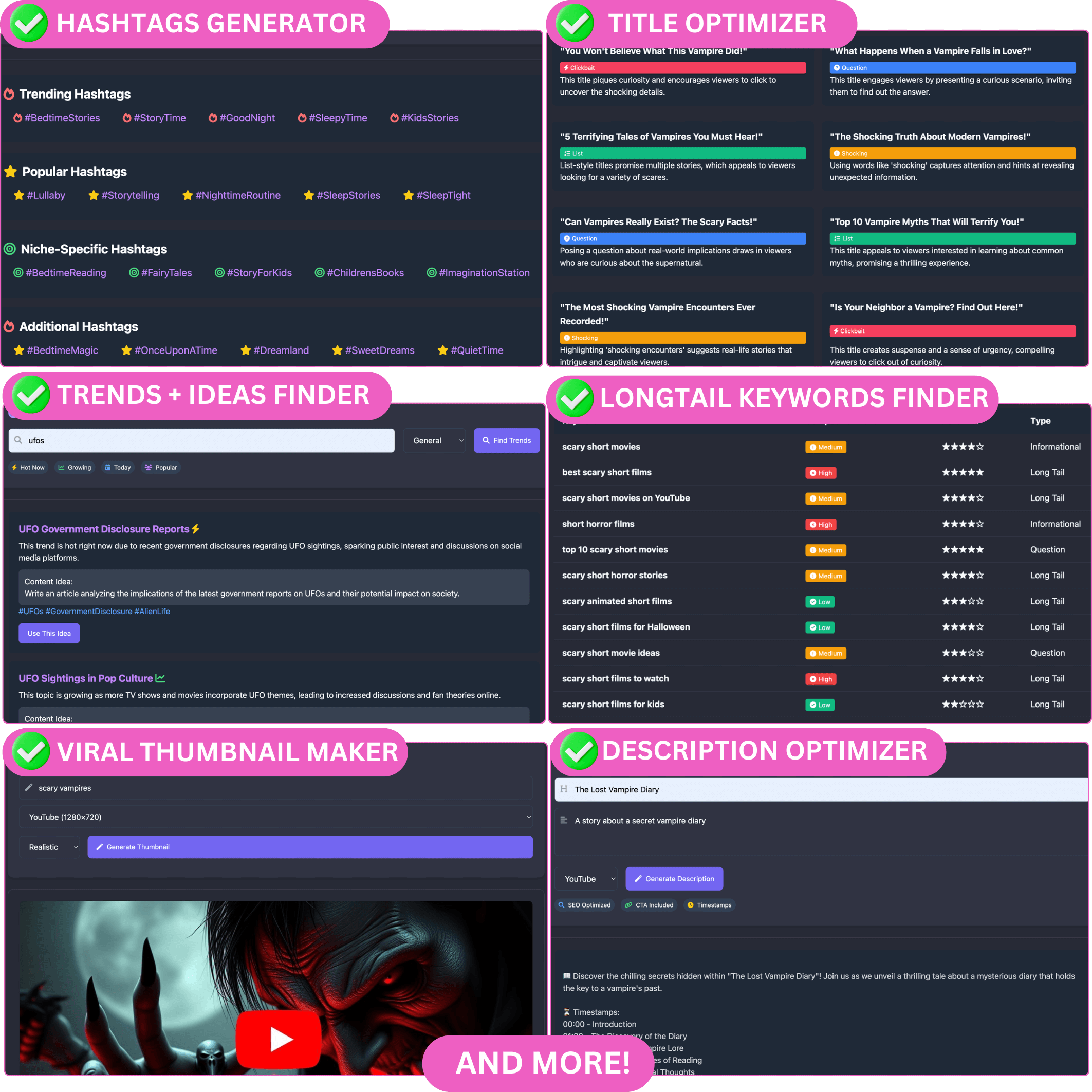 The AI optimization wizard will find fresh topics read to go viral, discover the best longtail keywords to rank for, optimize your video title and description, find hot hashtags, and even generate viral video thumbnails.